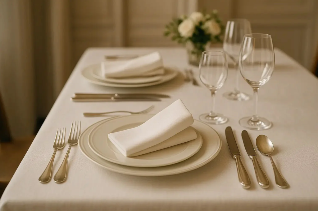 Les serviettes en tissu méritent une attention particulière. Nous privilégions des matières nobles, idéalement assorties à la nappe, car elles participent pleinement à l’atmosphère générale de la table. Leur propreté et leur repassage doivent être irréprochables : ces détails témoignent du soin apporté à la réception. Dans notre expérience professionnelle, nous observons que l’attention aux détails crée une impression durable, qu’il s’agisse d’une présentation ou d’un repas.